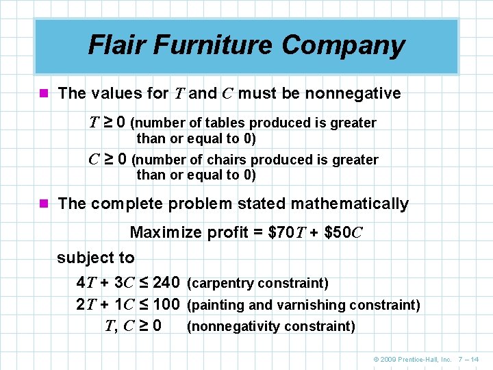 Flair Furniture Company n Similarly Painting and varnishing time used ≤ Painting and varnishing time available 2 T + 1 C ≤ 100 (hours of painting and varnishing time) This means that each table produced requires two hours of painting and varnishing time n Both of these constraints restrict production capacity and affect total profit © 2009 Prentice-Hall, Inc. 7 – 13