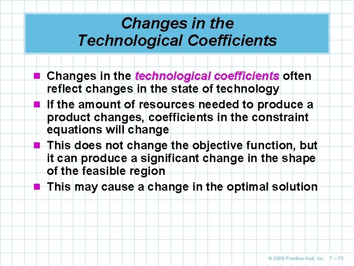 Changes in the Technological Coefficients n Changes in the technological coefficients often reflect changes in the state of technology n If the amount of resources needed to produce a product changes, coefficients in the constraint equations will change n This does not change the objective function, but it can produce a significant change in the shape of the feasible region n This may cause a change in the optimal solution © 2009 Prentice-Hall, Inc. 7 – 73