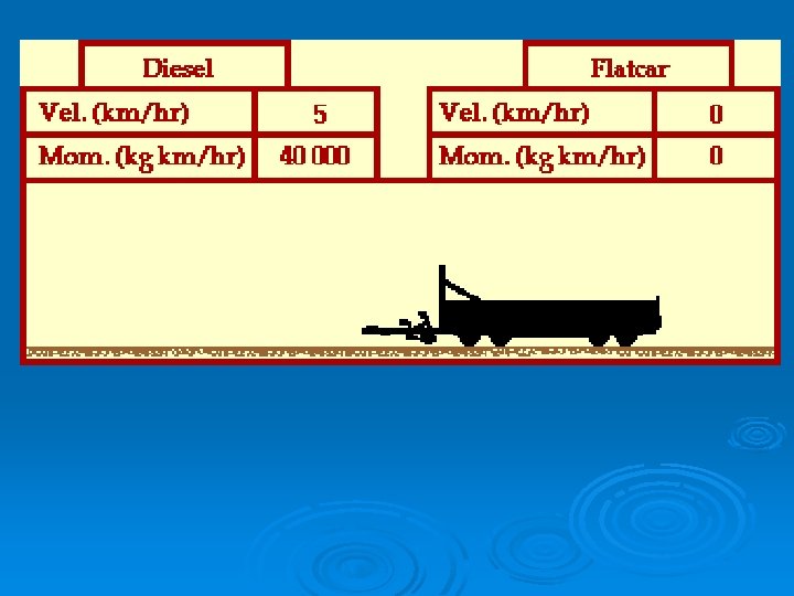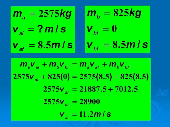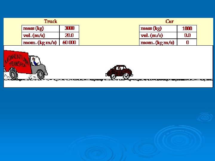 CAR/TRUCK EXAMPLE Before Collision Truck Car Total After Collision 3000 * 10 = 30 000 3000 * v 0 1000 * 15 = 15 000 30 000