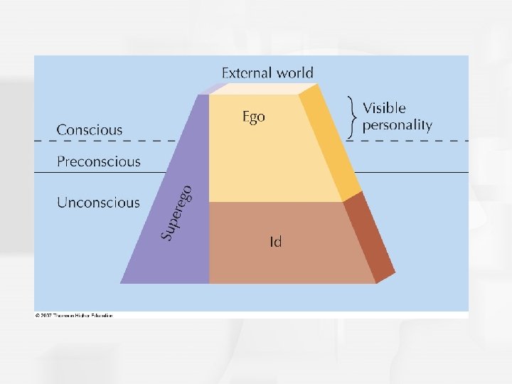 Unconscious et al • Unconscious: Holds repressed memories and emotions and the id’s instinctual drives • Conscious: Everything you are aware of at a given moment • Preconscious: Material that can easily be brought into awareness