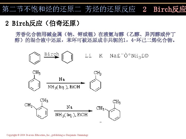 第二节不饱和烃的还原二 芳烃的还原反应 1 催化氢化 (高压高湿条件下) Copyright © 2004 Pearson Education, Inc. , publishing as Benjamin Cummings