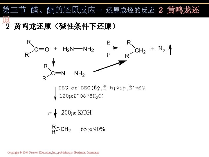 第三节 醛、酮的还原反应一 还原成烃的反应 2 黄鸣龙还 原 Copyright © 2004 Pearson Education, Inc. , publishing as Benjamin Cummings