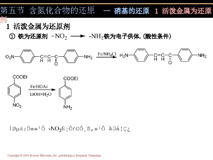 第五节 含氮化合物的还原 一 硝基的还原 1 活泼金属为还原 剂 ② Zn、Sn为还原剂 Copyright © 2004 Pearson Education, Inc. , publishing as Benjamin Cummings