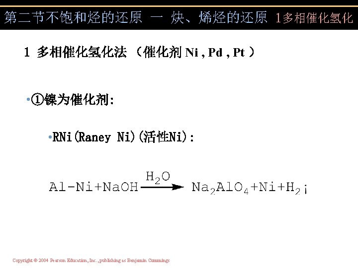 第二节不饱和烃的还原 一 炔、烯烃的还原 1多相催化氢化 Copyright © 2004 Pearson Education, Inc. , publishing as Benjamin Cummings