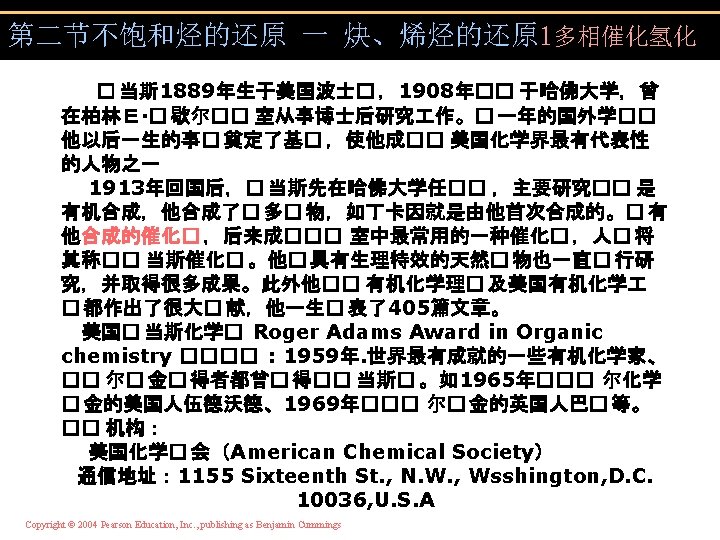 第二节不饱和烃的还原 一 炔、烯烃的还原 1多相催化氢化 ③铂(Pt)为催化剂 亚当斯催化剂 Copyright © 2004 Pearson Education, Inc. , publishing as Benjamin Cummings