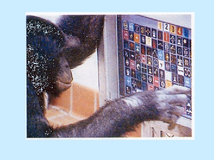 Studies with Chimpanzees ® Lana learned to press computer keys with symbols representing words but was unable to manipulate grammatical relations ® Nim Chimpski was taught manual signing but her signed messages did not increase in length as children’s do
