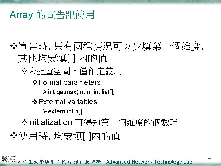 本章重點 v. Declaring and referencing arrays v. When the array name with no subscript, it represents an address, the address of the initial array element (陣列與指標的曖昧關係) vconst 中正大學通訊 程系 潘仁義老師 Advanced Network Technology Lab 2