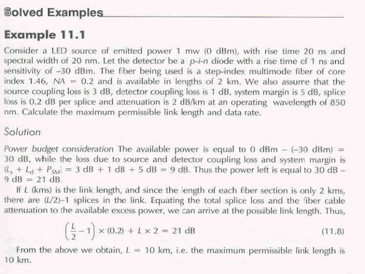 Example 8. 3 The following parameters were choosen for a long haul single mode optical fiber system operating at 1. 3µm. Mean power launched from laser = - 3 d. Bm Cabled fiber loss = 0. 4 d. B/km Splice loss = 0. 1 d. B/km Connector loss at transmitter and receiver = 1 d. B each Mean power required at the APD When operating at 35 Mbps(BER = 10 -9) -55 d. Bm When operating at 400 Mbps(BER = 10 -9) -44 d. Bm Required safety margin = +7 d. B