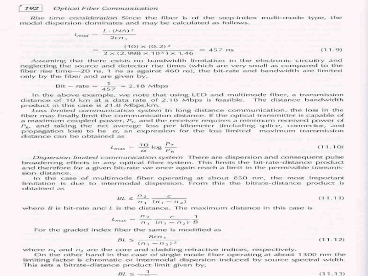 Solution: Tsyst = 1. 1(TS 2 + TF 2 + TD 2) = 1. 1 [82 + (8 x 5)2 + (8 x 1)2 + 62)1/2] = 46. 2 ns Max bit rate = Maximum bit rate = 15. 2 Mbps Or 3 d. B optical BW = 7. 6 MHz