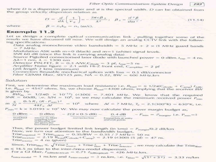 Example 8. 5 An optical communication system is given with the following specifications: Laser: = 1. 55µm, = 0. 15 nm, power = 5 d. Bm, tr = 1. 0 ns Detector: t. D = 0. 5 ns, sensitivity = -40 d. Bm Pre-amp: t A = 1. 3 ns Fiber: total dispersion (M+Mg) = 15. 5 psnm-1 km-1, length = 100 km, = 0. 25 d. B/km Source coupling loss = 3 d. B Connector (2) loss = 2 d. B Splice (50) loss = 5 d. B System: 400 Mbps, NRZ, 100 km