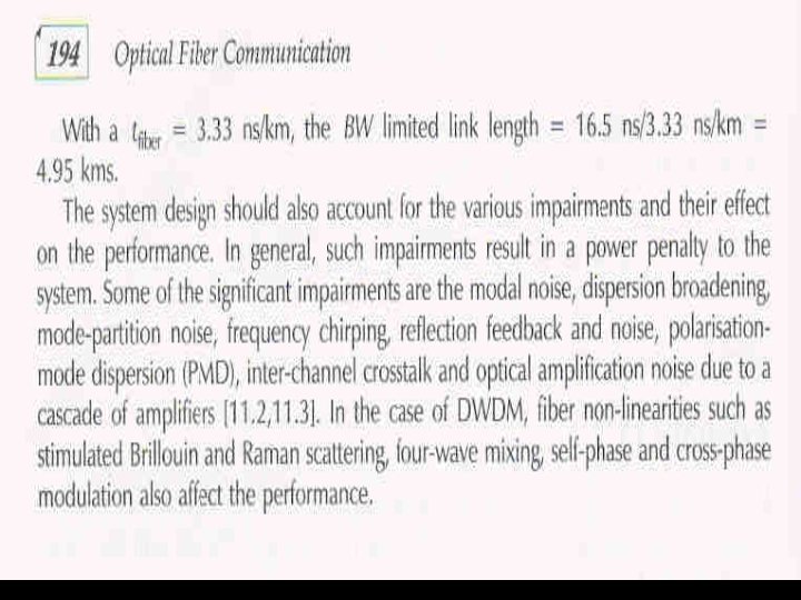 Example 8. 2 An optical link is to be designed to operate over an 8 -km length without repeater. The risetime of the chosen components are: Source: 8 ns Fiber: Intermodal 5 ns/km Intramodal 1 ns/km Detector 6 ns From the system risetime considerations estimate the maximum bit rate that may be achieved on the link using NRZ code.