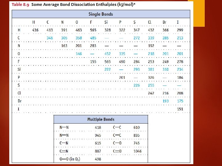 Average Bond Enthalpies NOTE: These are average bond enthalpies, not absolute bond enthalpies; the C-H bonds in methane, CH 4, will be a bit different than the C-H bond in chloroform, CHCl 3. © 2009, Prentice-Hall, Inc.
