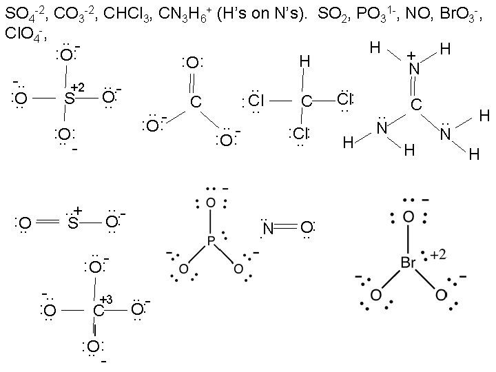 More Practice • Draw lewis structures for: • SO 4 -2, CO 3 -2, CHCl 3, CN 3 H 6+ (H’s are attached to the N’s). SO 2, PO 33 -, NO 2 -1, Br. O 3 -, Cl. O 4 -,