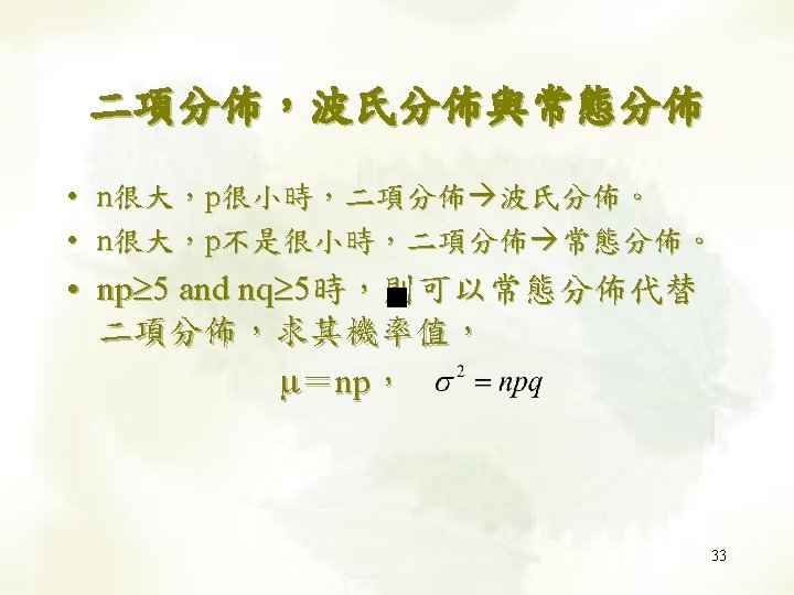 Finding Values of Z • Example 8. 3 & 8. 4 – – Determine z exceeded by 5% of the population Determine z such that 5% of the population is below • Solution z. 05 is defined as the z value for which the area on its right under the standard normal curve is. 05. 0. 45 0. 05 -Z 0. 05 0 Z 0. 05 1. 645 32