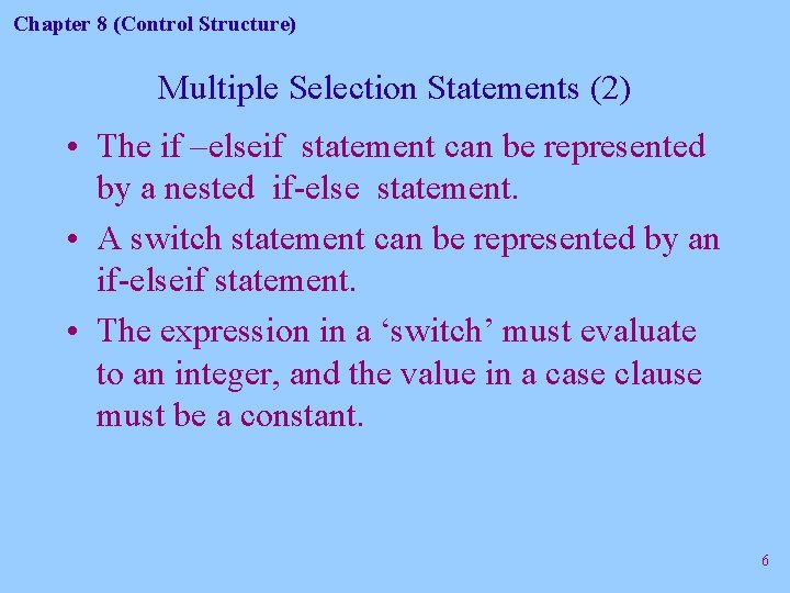 Chapter 8 (Control Structure) Multiple Selection Statements (1) If-elseif statement if (expr) {. . . } else {. . . } Switch statement switch (expr) { case v 1: . . . case clause then clause case v 2: . . . case vn: default: elseif clause. . . default clause } else clause 5