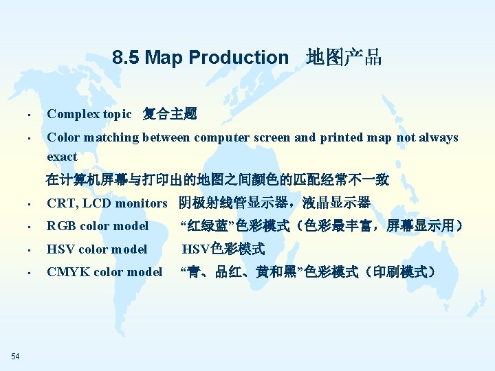8. 5 Map Production 地图产品 • Hard copy, soft copy 硬拷贝,软拷贝 • Soft copy maps may be printed, exported to Internet, projected, exported to other software, or further processed for publishing 软拷贝地图可以打印出来,输出到网络上,用于计算 机投影,输出到其他软件里,或者为了出版作进一步 处理 53
