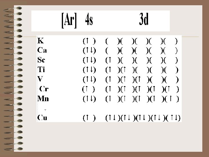 Above Sc put d 1; above Ti put d 2; above V put d 3; above Cr put d 5; above Mn put d 5; above Fe put d 6; above Co put d 7; above Ni put d 8; above Cu put d 10; above Zn put d 10. Outside the lanthanides and actinides put (n - 2)f IV. Magnetic Properties of Atoms A) Unpaired electrons give a paramagnetic substance.