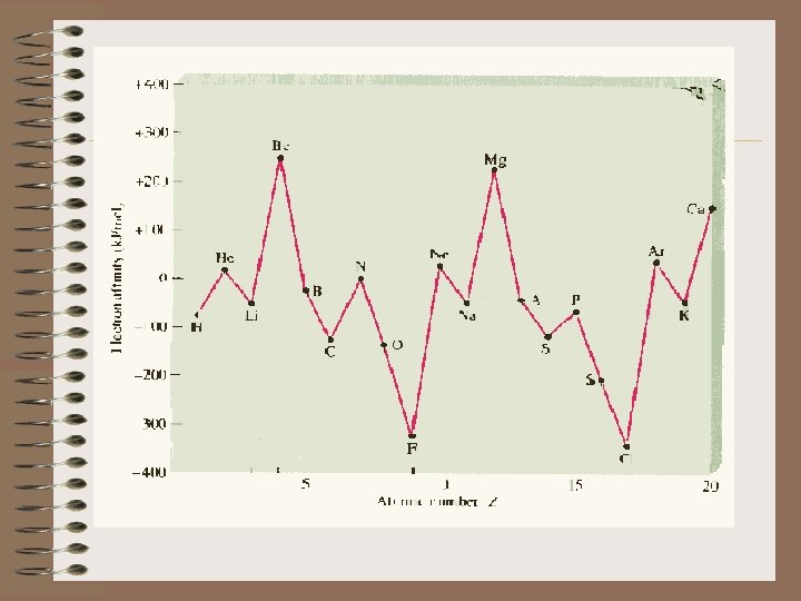 9) Put in order of increasing first ionization energy the following elements: CNOF G) ELECTRON AFFINITY 1) Electron affinity is the energy change which occurs when an electron is accepted by an atom in the gaseous state. A(g) + e A-(g) 2) In contrast to ionization energy, what do we observe on the following graph of EA's?