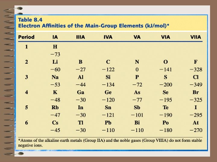 The greater the negative value of the electron affinity, the greater the tendency of an atom to accept an electron. d) A + H indicates that energy must be absorbed for an atom to gain an electron. e) As we go from left to right on the periodic chart, the elements have, in general, an increasing tendency to form negative ions. However, there are more exceptions than with Ionization Energy.