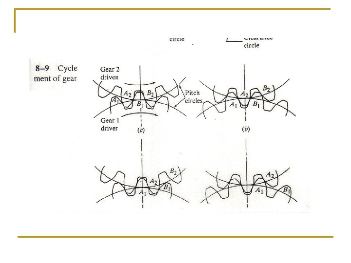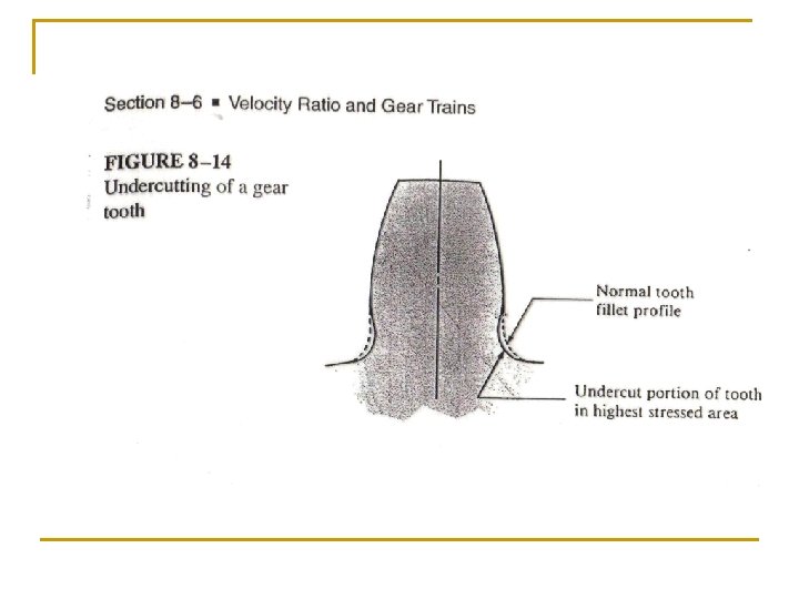 Gear Nomenclature Notes n Clearance maybe a problem for small pinions driving large gears, therefore they won’t mesh and will lock up (See Table 8 -6) n As NP decreases so does max NG n If design necessatates small pinion, maybe able to increase clearance by undercutting gear tooth (See Figure 8 -14)