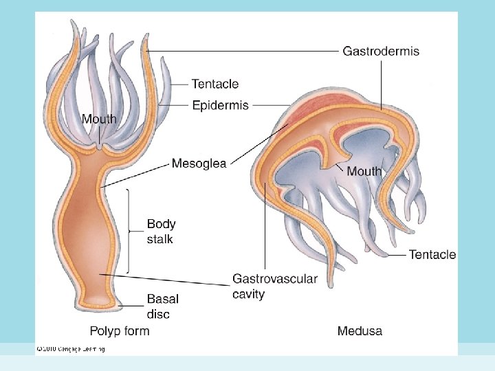 Organization of the Cnidarian Body • Radial symmetry: many planes can be drawn through the central axis that will divide the animal into equivalent halves • Often exhibit 2 body plans within their life cycles: – polyp: benthic form characterized by a cylindrical body with an opening at 1 end, i. e. , the mouth which is surrounded by tentacles – medusa: a free-floating stage (jellyfish) • Many cnidarians have both body plans, corals and sea anemones exist as polyps
