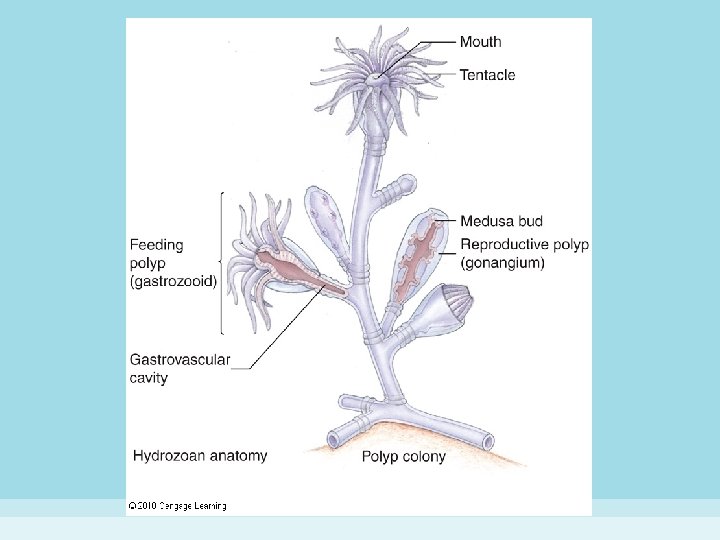 • Hydrozoans (class Hydrozoa) – mostly colonial – hydrozoans known as hydrocorals secrete a calcareous skeleton, e. g. , fire coral – some produce floating colonies • e. g. Portuguese man-of-war