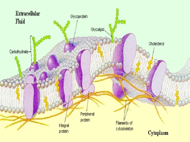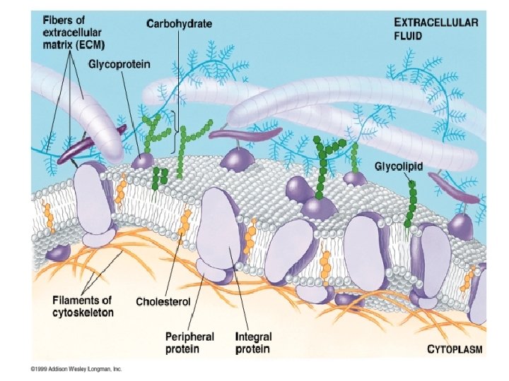 Membrane Structure, II v v v Phospholipids - membrane fluidity Cholesterol - membrane stabilizatio “Mosaic” Structure due to: Integral proteins - transmembrane proteins Peripheral proteins - surface of membrane Membrane carbohydrates -~ cell to cell recognition; oligosaccharides (cell markers); glycolipids; glycoproteins