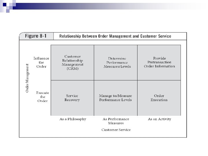 Customer service: Performance ¨ emphasizes customer service as specific performance measures that pervade all three definitions of customer service and address strategic, tactical, and operational aspects of order management. Activity ¨ treats customer service as a particular task that an organization must perform to satisfy a customer’s order requirements.
