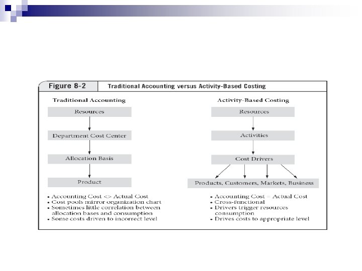 Activity-Based Costing ¨ ABC measures the cost and performance of activities, resources, and cost objects. Resources are assigned to activities, then activities are assigned to cost objects based on their use ¨ Traditional cost accounting is well suited to situations where an output and an allocation process are highly correlated. ¨ Traditional cost accounting is not very effective in situations where the output is not correlated with the allocation base.