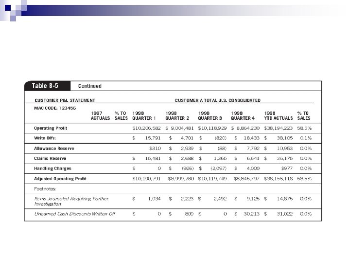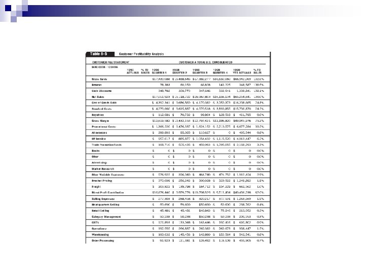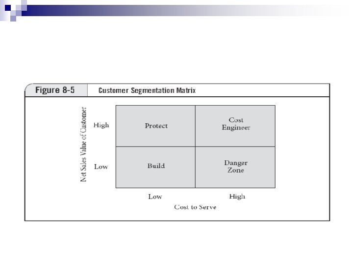 One method to classify customers by profitability. Protect Zone ¨ Those customers who fall into the “Protect” segment are the most profitable. Danger Zone ¨ Customers in the “Danger Zone” segment are the least profitable and incur a loss. ¨ The firm has three alternatives for danger zone customers: n (1) change customer interaction with firm so the customer can move to another segment n (2) charge the customer the actual cost of doing business n (3) switch the customer to an alternative distribution channel Build Zone ¨ These customers have a low cost to serve and a low net sales value, so the firm should maintain the cost to serve and build net sales value to help drive the customer into the “Protect” segment.