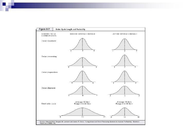 Order Cycle Time: n the time that elapses from when a buyer places an order until receipt of the order n absolute length and reliability of order cycle time influences both firm’s inventories, resulting in impacts on both revenues and profits for both organizations