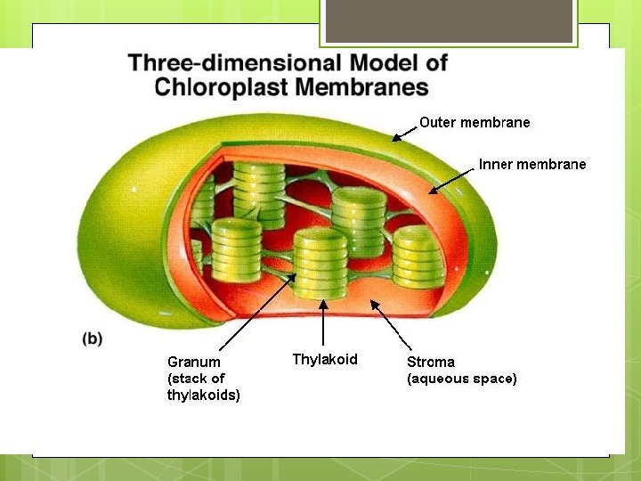 INSIDE A CHLOROPLAST n Photosynthesis takes place in chloroplasts. n Chloroplasts contain saclike photosynthetic membranes called thylakoids. n n Thylakoids contain clusters of chlorophyll and other pigments and proteins known as photosystems that are able to capture sunlight. Light dependent reactions take place here. n Thylakoids are arranged in stacks known as grana. n The region outside thylakoid membrane is called the stroma. n Light independent (dark) reactions take place here.