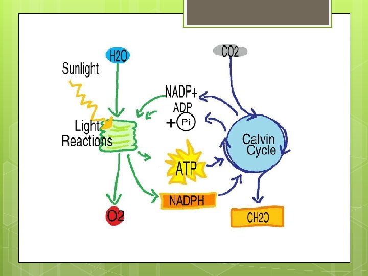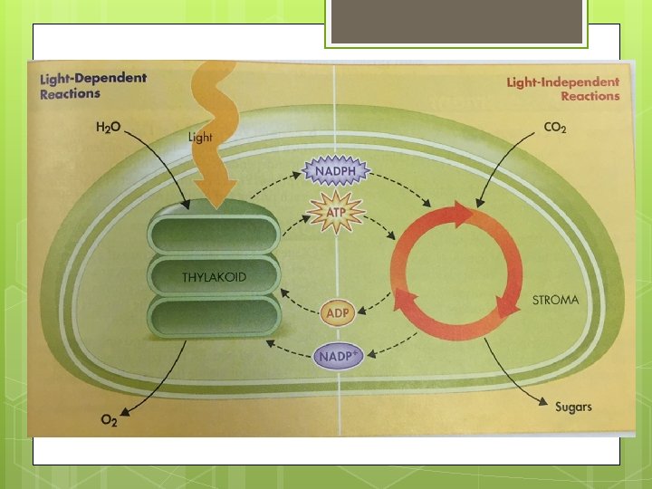 Light and Dark Rxns n Light-dependent reactions produce oxygen and make energy storing compounds (ATP and NADPH). n n n Occurs by converting ADP and NADP+ into ATP and NADPH. These reactions REQUIRE light. Light-independent (dark) reactions use the energy stored in NADPH and ATP to make glucose. n n Glucose is more stable and can store up to 100 times more energy than NADPH and ATP. These reactions do not require light.