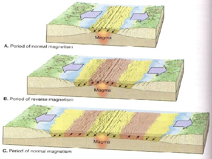 More evidence… Magnetic reversals recorded in rocks along the mid-ocean ridges support Seafloor Spreading and Plate Tectonics. The direction of the Earth’s magnetic field are preserved in the new rock formed at the ridges. The poles switch and are seen in a pattern of bands paralleling mid-ocean ridges. http: //www. wwnorton. com/college/ geo/egeo/animations/ch 2. htm