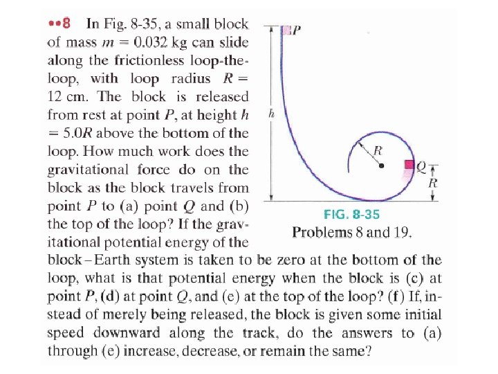 Work and Potential Energy: B g h v 0 A During the trip from A to B: The gravitational force Fg does negative work W 1 = -mgh. Energy is transferred by Fg from the kinetic energy of the tomato to the gravitational potential energy U of the tomato-Earth system. During the trip from B to A: The transfer is reversed. The work W 2 done by Fg is positive ( W 2 = mgh ). The gravitational force transfers energy from the gravitational potential energy U of the tomato-Earth system to the kinetic energy of the tomato. The change in the potential energy U is defined as