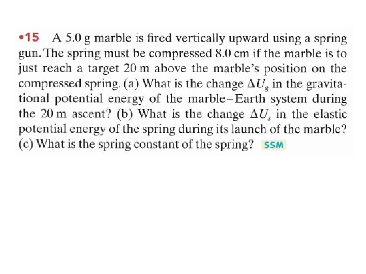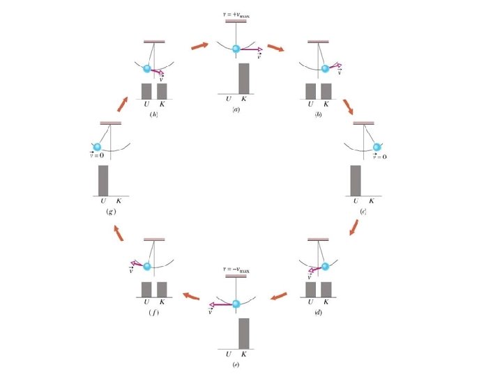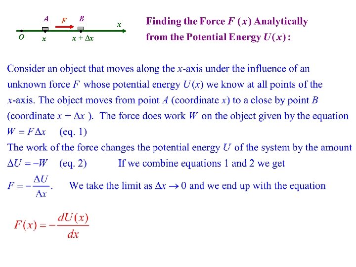 B A k m A B During the trip from A to B: The spring force Fs does negative work W 1 = kx 2/2. Energy is transferred by Fs from the kinetic energy of the mass to the potential energy U of the mass-spring system. During the trip from B to A: The transfer is reversed. The work W 2 done by Fs is positive ( W 2 = kx 2/2 ). The spring force transfers energy from the potential energy U of the mass-spring system to the kinetic energy of the mass. The change in the potential energy U is defined as
