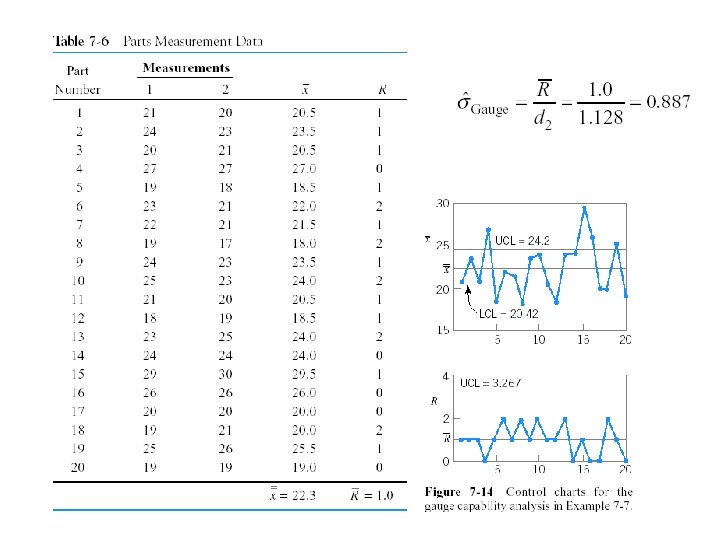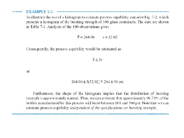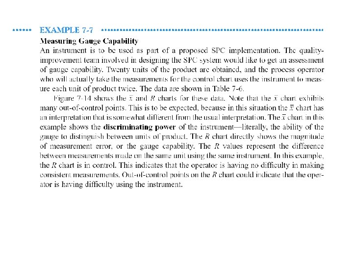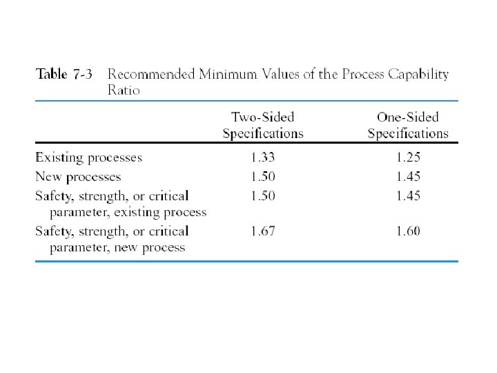 k = 5. 15 → number of standard deviation between 95% tolerance interval Containing 99% of normal population. k = 6 → number of standard deviations between natural tolerance limit of normal population. For Example 7 -7, USL = 60 and LSL = 5. With k =6 P/T ≤ 0. 1 is taken as appropriate.