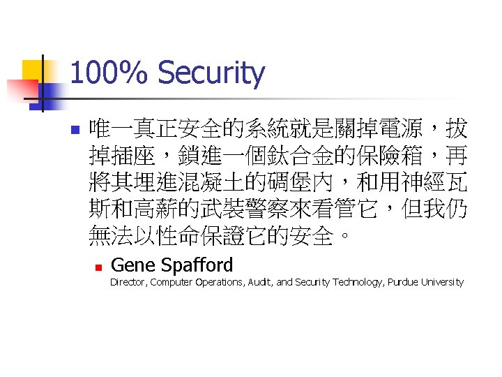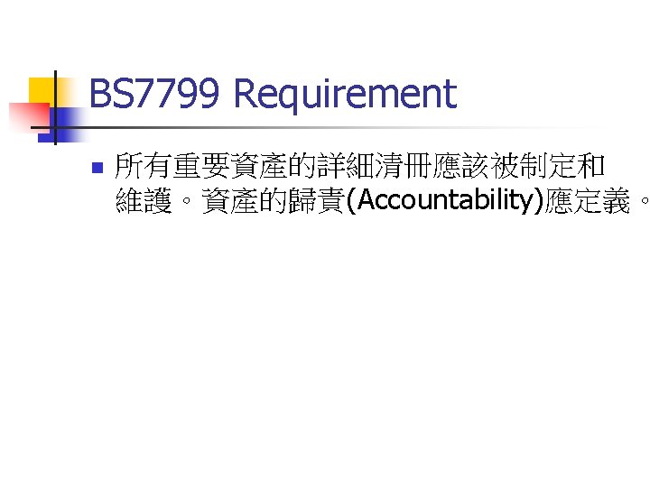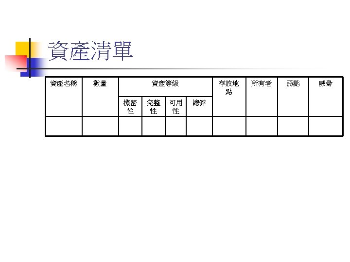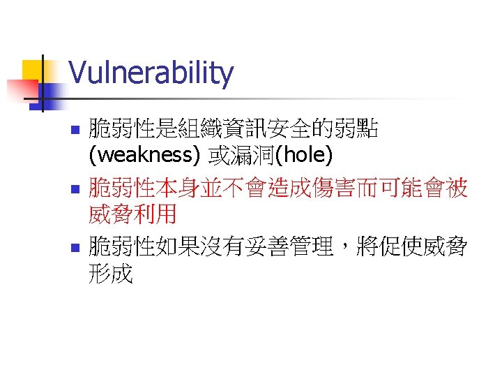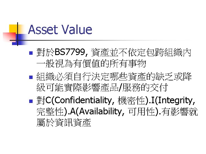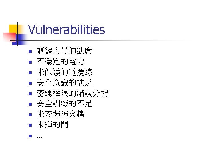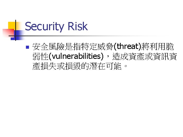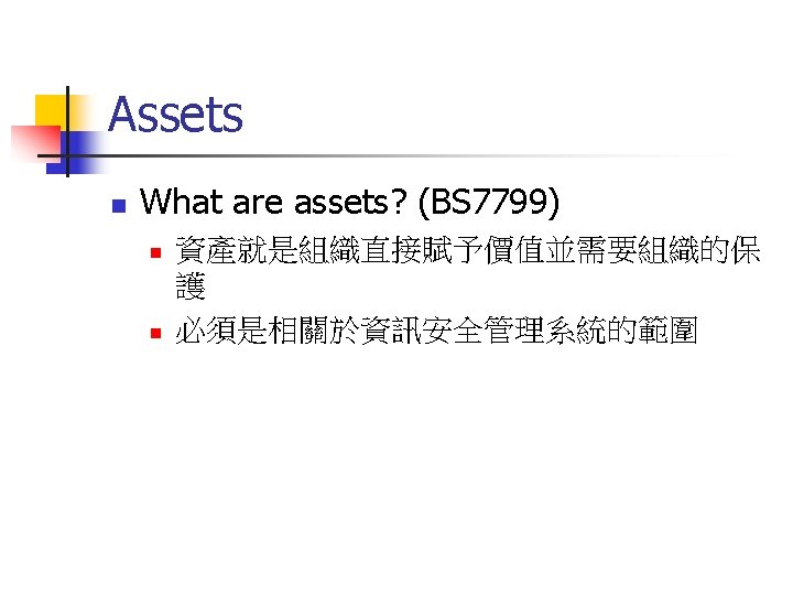 Assets n Examples of assets associated with information systems are n n n n Information assets – data files, user manuals etc. Paper documents – contracts, guidelines etc. Software assets – application & system software etc. Physical assets – computer, magnetic media etc. People – customers, personnel etc. Company image and reputation Services – communications, 電力, 網路, technical etc.
