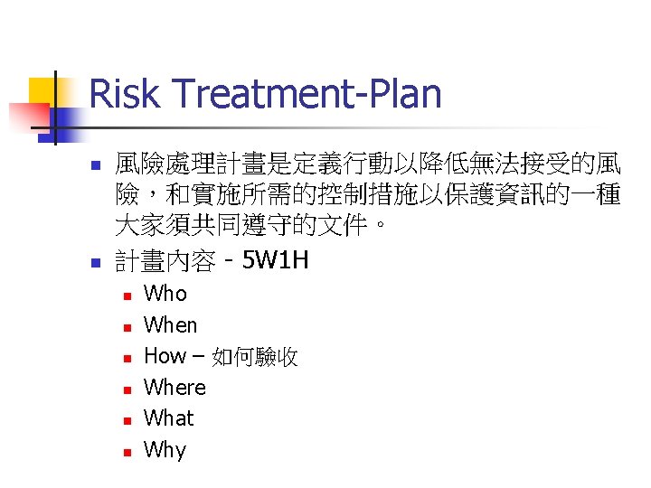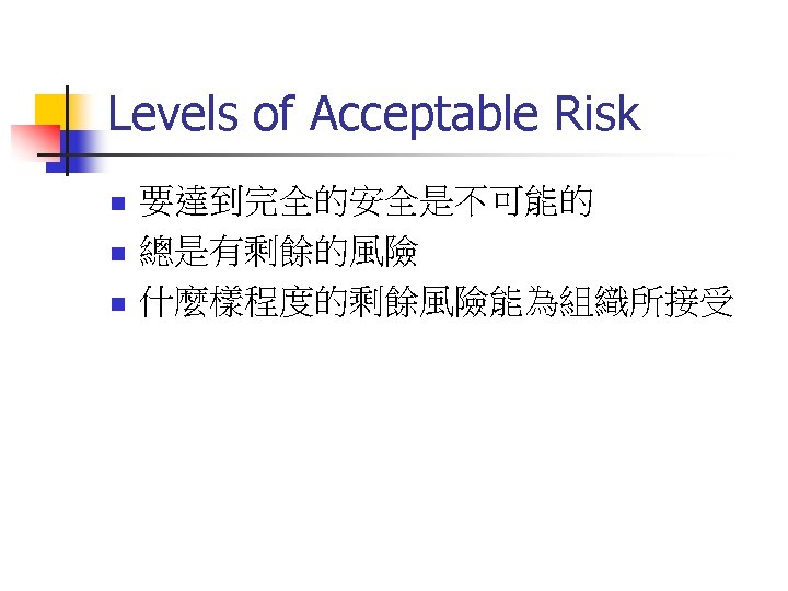 Risk Assessment Process n 用流程的方法 n Identifying assets and assigning values n n n 資產非僅限於財務部資產清冊內容 以重要性評估非購入價格 Identifying threats to these assets and assessing their likelihood (定性評估) Identifying vulnerabilities and assessing how easily they might be exploited (如何被利用) Identifying the protection provided by the controls in place Assessing the overall risk resulting from the above