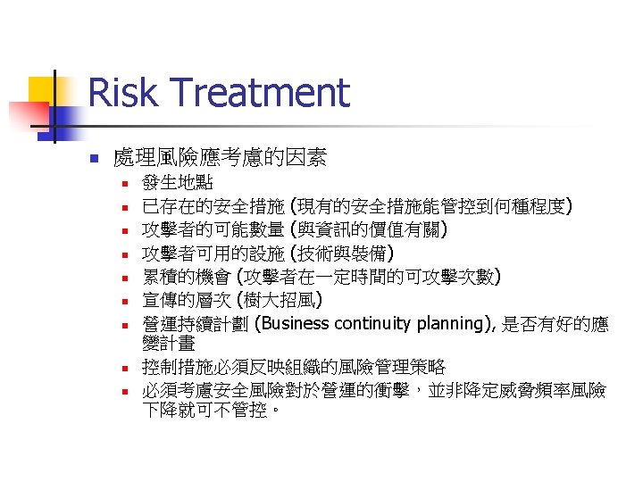 Ranking of Threads by Measures of Risk n 對單一資產 Thread A Imapct B Likelihood of Thread Occurrence C Measure of Risk D=BXC Threat Ranking E Thread 1 5 2 10 2 Thread 2 2 4 8 3 Thread 3 3 5 15 1 Thread 4 1 3 3 5 Thread 5 4 1 4 4 Thread 6 2 4 8 3