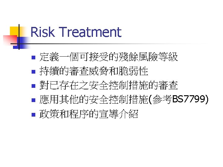 Risk Assessment & Risk Treatment Assets and asset values n Security threats and vulnerabilities (威脅和弱 點) n Risk assessment n Treatment of the risks n Security controls and countermeasures (對策) 相關標準: ISO 13335 Risk Assessment 方法 n Statement of applicabiliity AN 4360 (紐澳標準) n