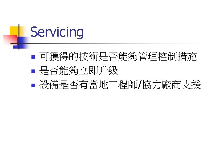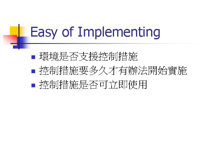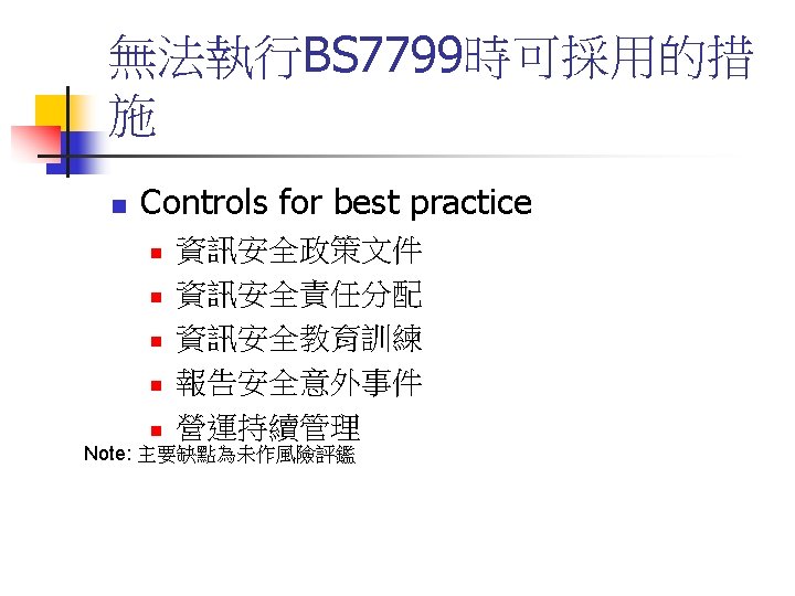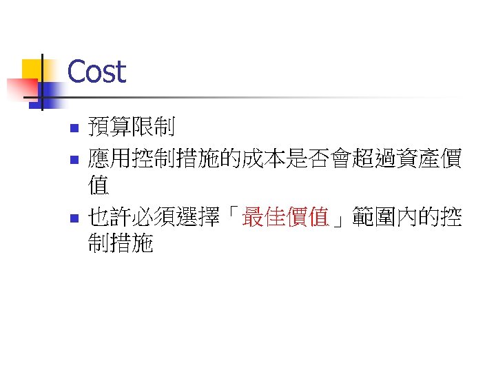 Control Selection n 考量因素 n n n n Risk Degree of assurance required Cost Easy of implementing Servicing (支援服務) 法律和法規的要求 客戶和其他合約的要求 (加密, 數位簽章, …)