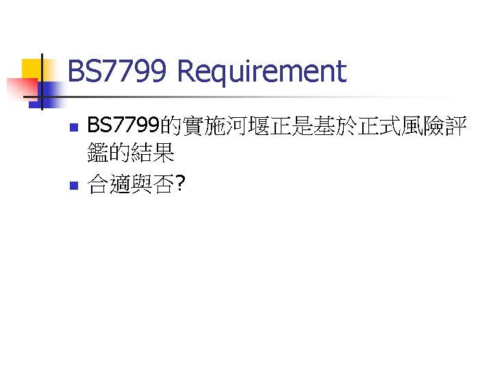 Tools and Methods for Risk Assessment n What tool does BS 7799 recommend? n 風險評鑑應該鑑別對組織資產的威脅,脆弱 性,和衝擊而且應該決定風險程度。