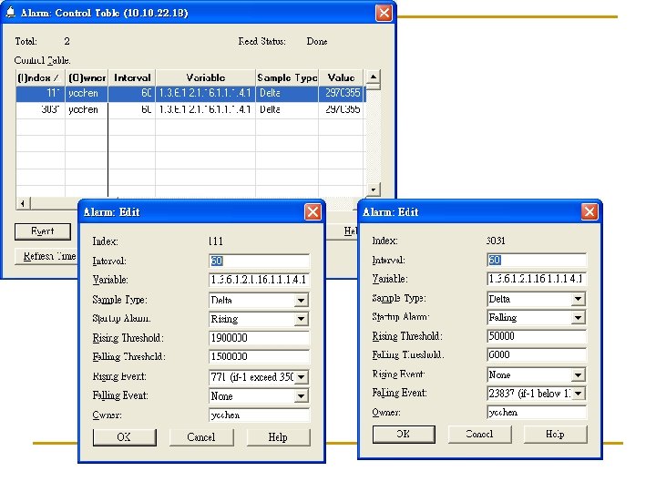 alarm rising. Alarm(1), falling. Alarm(2), rising. Or. Falling. Alarm(3 ) alarm. Table alarm. Entry alarm. Index alarm. Interval alarm. Variable absolute. Value(1), alarm. Sample. Type delta. Value(2) alarm. Value alarm. Startup. Alarm alarm. Rising. Threshold alarm. Falling. Threshold alarm. Rising. Event. Index alarm. Falling. Event. Index alarm. Owner alarm. Status