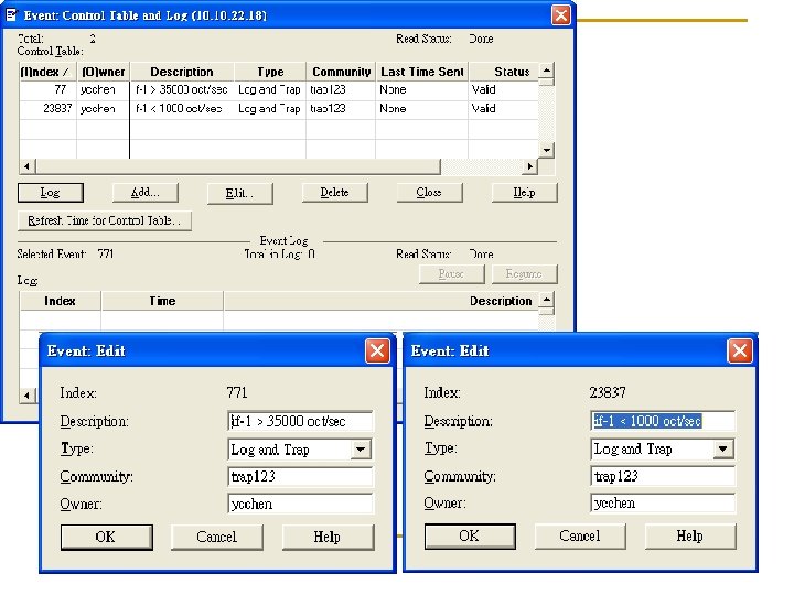event. Table event. Entry event. Index event. Description event. Type event. Community event. Last. Time. Sent event. Owner event. Status none(1), log(2), snmptrap(3), logandtrap(4) rmon 9 log. Table log. Entry log. Event. Index log. Time log. Description