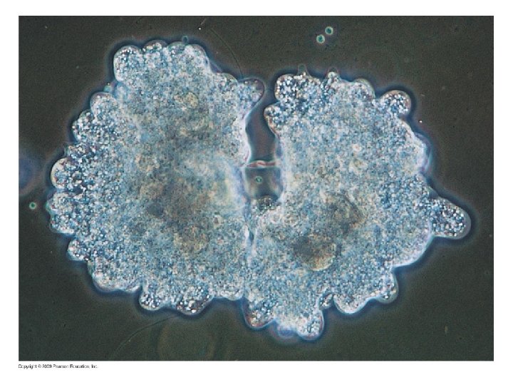 8. 3 Prokaryotes reproduce by binary fission § Binary fission means “dividing in half” – Occurs in prokaryotic cells – Two identical cells arise from one cell – Steps in the process – A single circular chromosome duplicates, and the copies begin to separate from each other – The cell elongates, and the chromosomal copies separate further – The plasma membrane grows inward at the midpoint to divide the cells Copyright © 2009 Pearson Education, Inc.