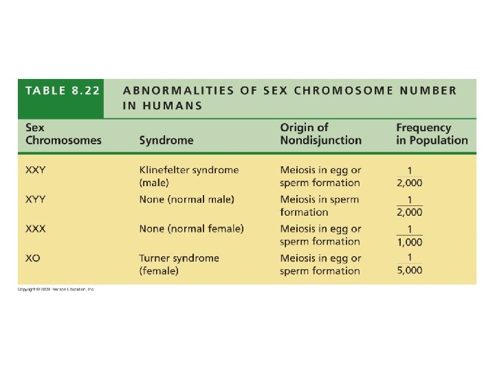 8. 21 Accidents during meiosis can alter chromosome number § Nondisjunction is the failure of chromosomes or chromatids to separate during meiosis – During Meiosis I – Both members of a homologous pair go to one pole – During Meiosis II – Both sister chromatids go to one pole § Fertilization after nondisjunction yields zygotes with altered numbers of chromosomes Copyright © 2009 Pearson Education, Inc.