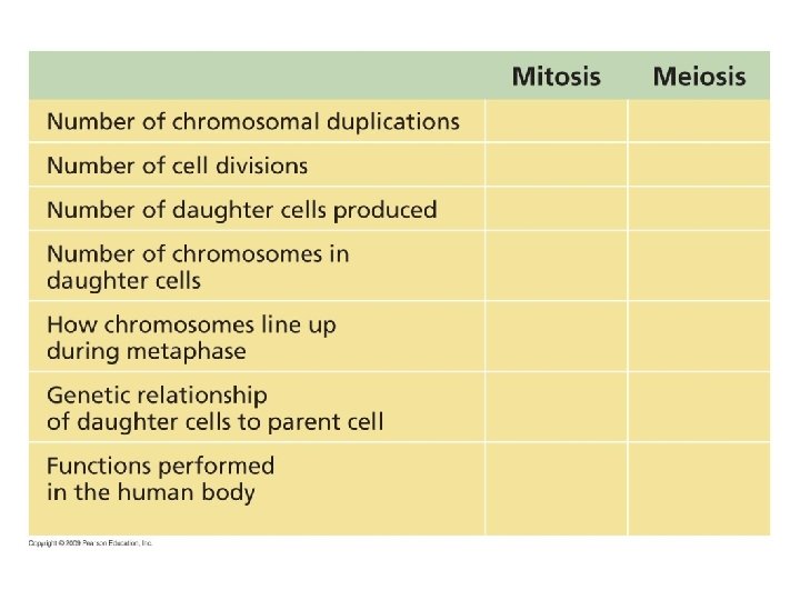 8. 15 Mitosis and meiosis have important similarities and differences § What is the outcome of each process? – Mitosis: two genetically identical cells, with the same chromosome number as the original cell – Meiosis: four genetically different cells, with half the chromosome number of the original cell Copyright © 2009 Pearson Education, Inc.