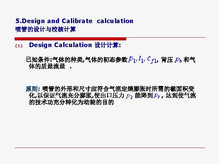 Design Procedure (设计步骤) A. Choose the shape of the nozzle (选择外形) 根据背压的高低选择适当形状的喷管: 当 时, 选择渐缩喷管(convergent nozzle); 当 时, 选择缩放喷管(divergent- convergent nozzle)