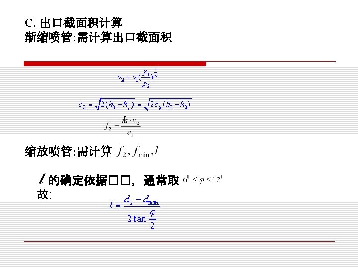 B. Exit velocity calculation (出口流速的计算) For Convergent Nozzle (渐缩喷管): For convergent-divergent nozzle, the velocity at the throat (对缩放喷管, 喉部流速):